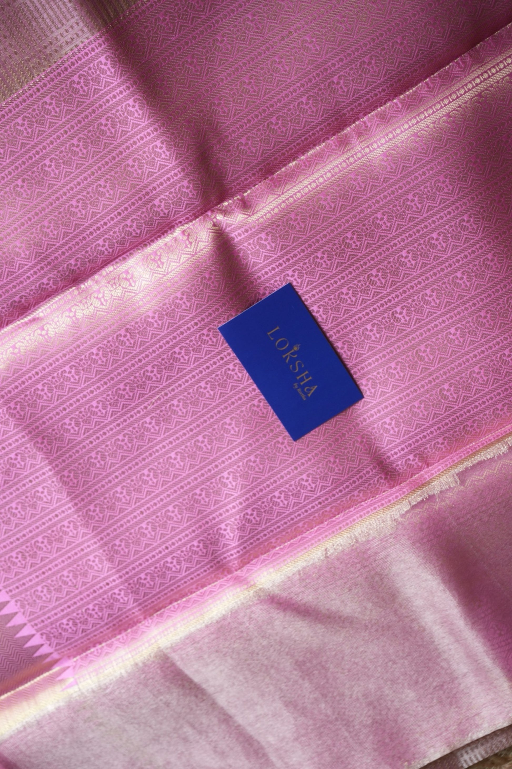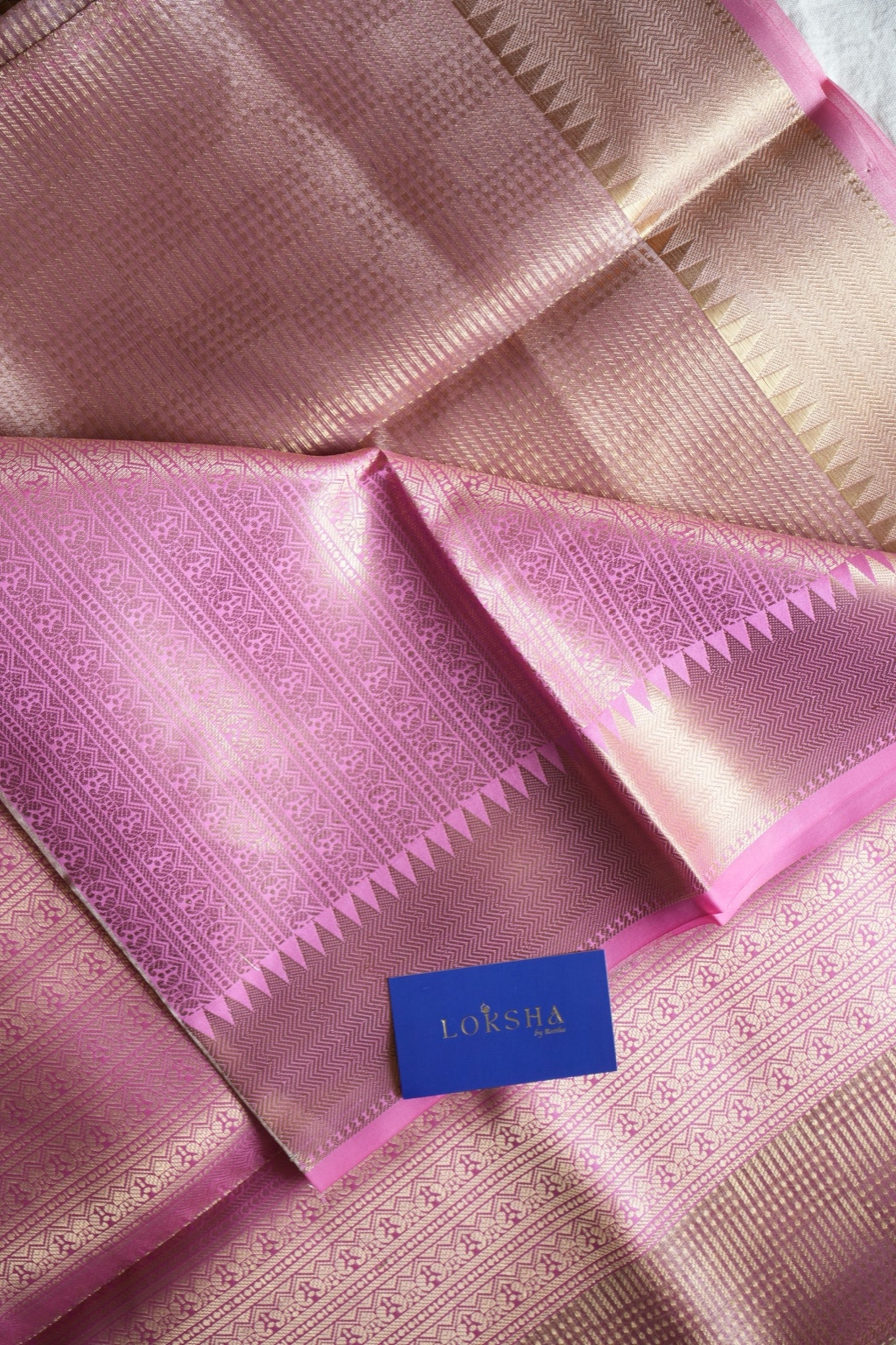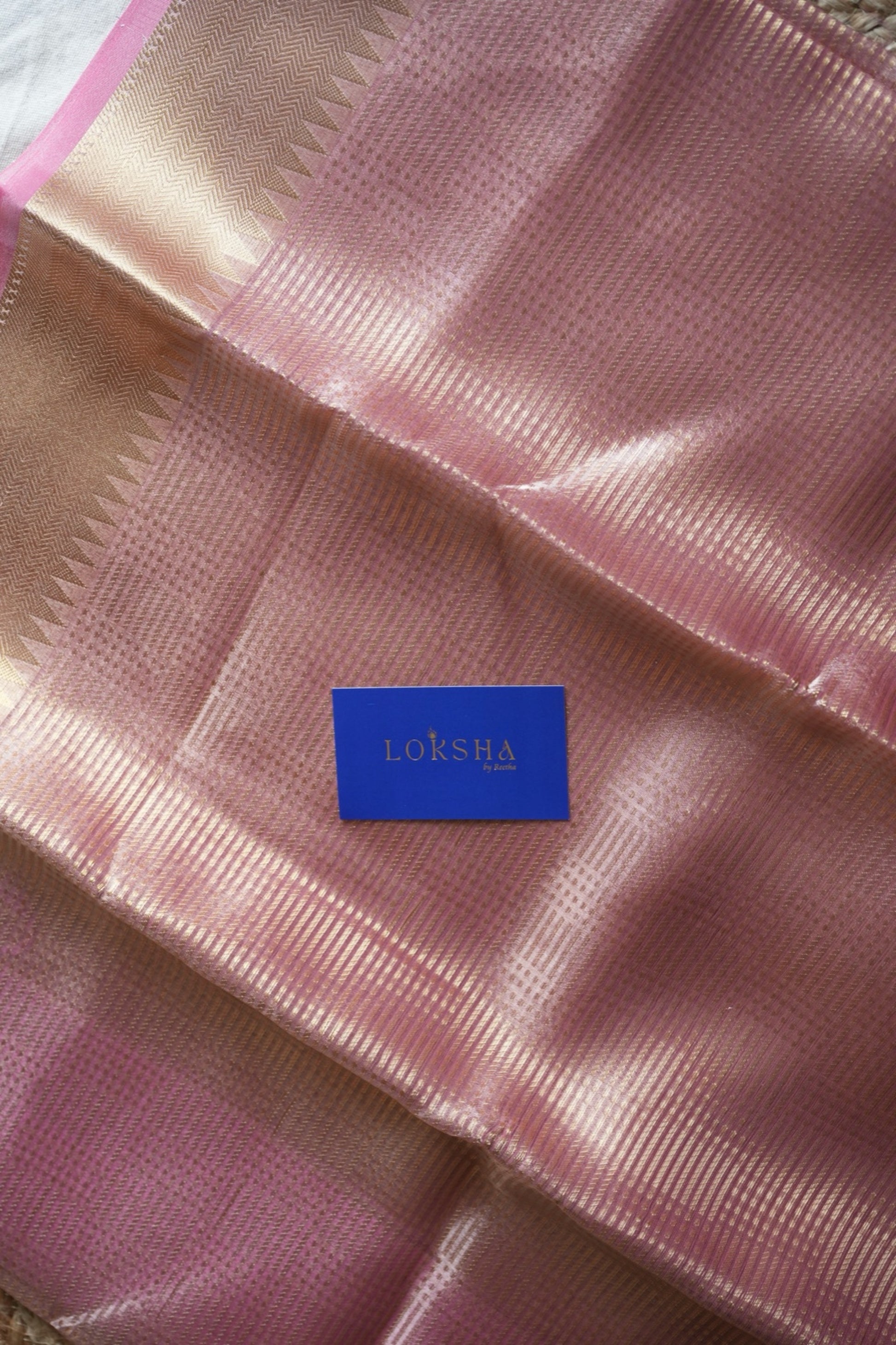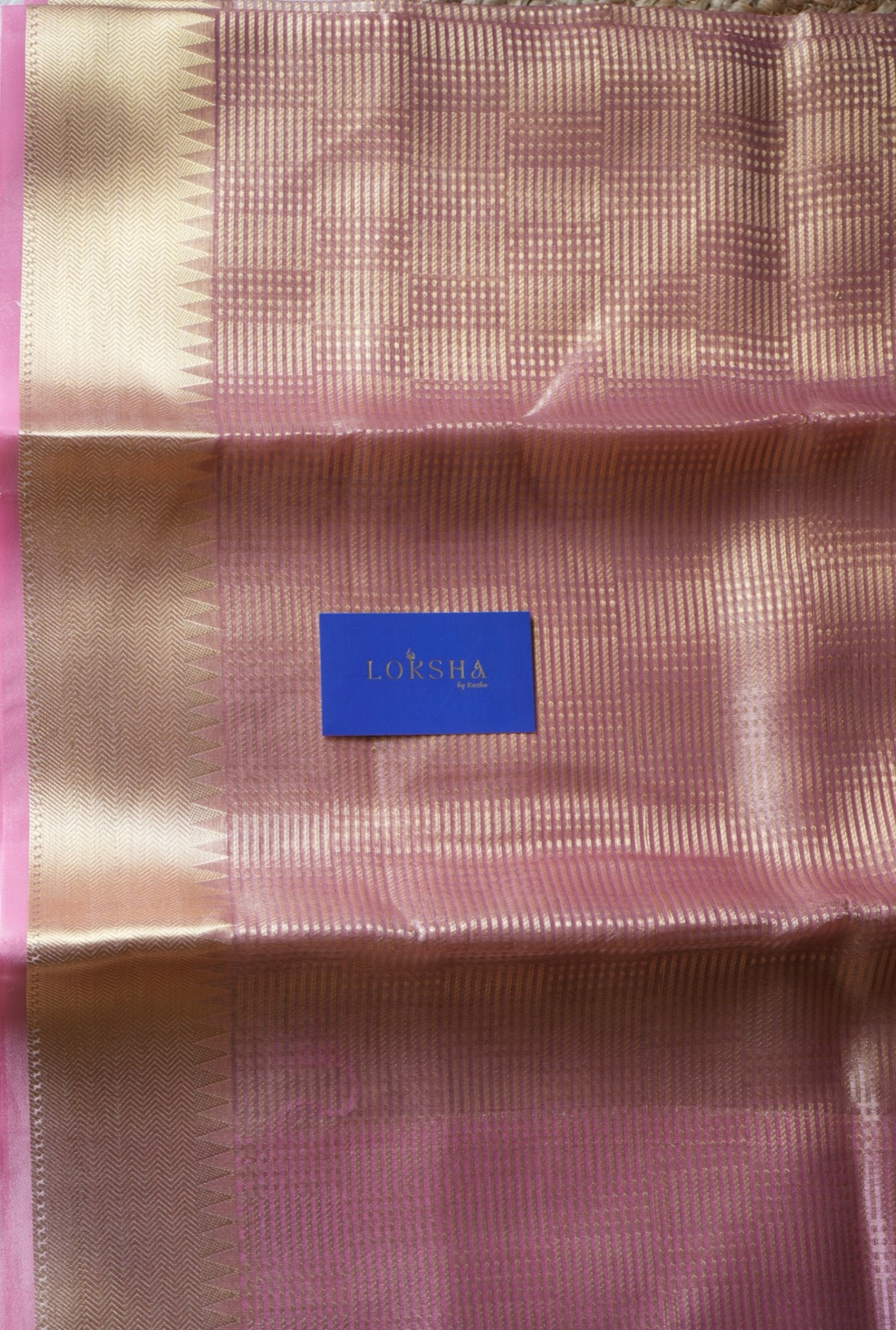 Drape yourself in our exquisite tissue silk saree in a breathtaking blush pink and gold weave. Intricate geometric designs adorn the saree, enhancing its luxurious appeal.