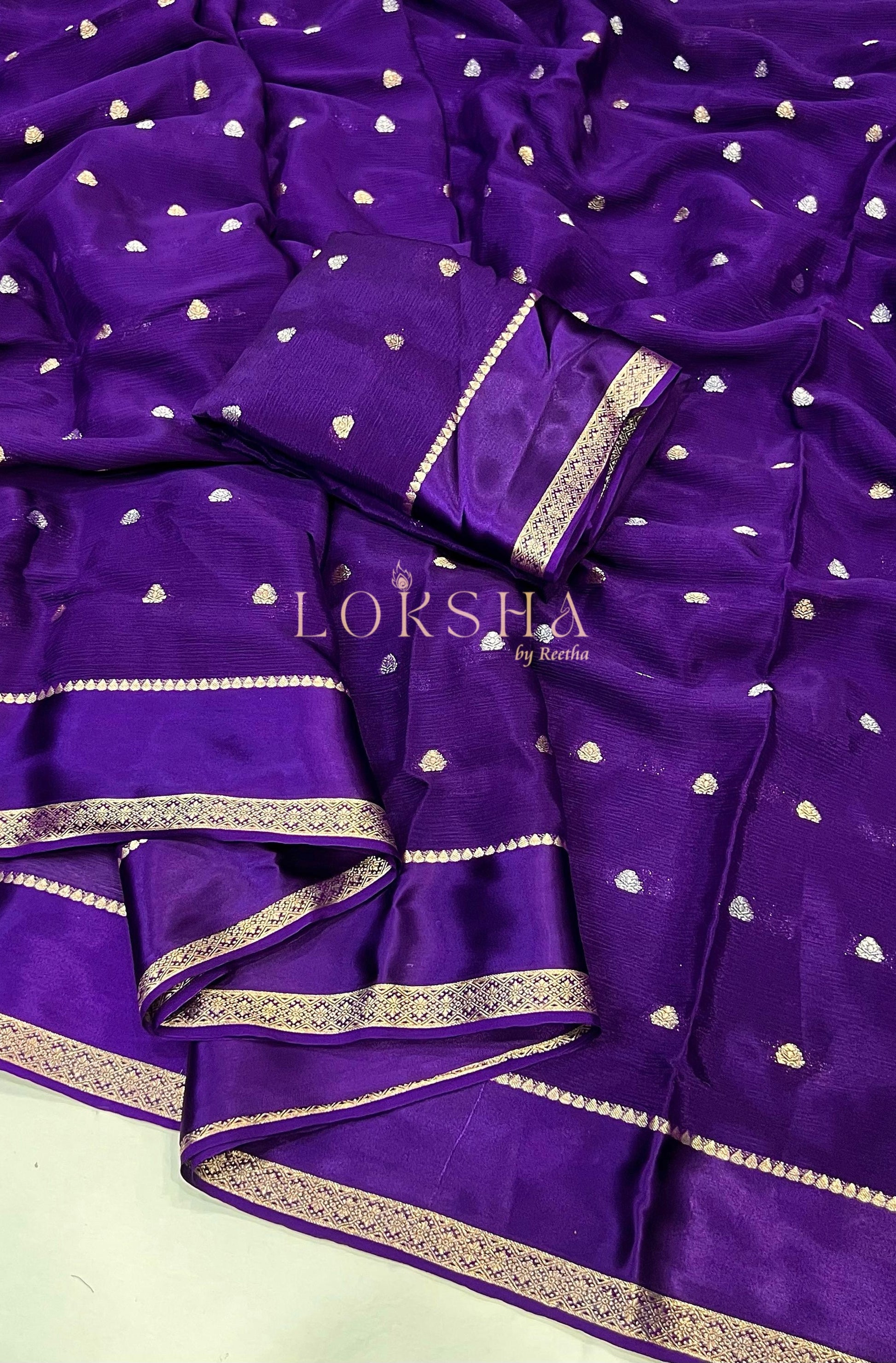 Draped in royal dreams, a violet hue with golden gleams.Soft and light as air, a saree woven with tender care specially for all the beauties out there.