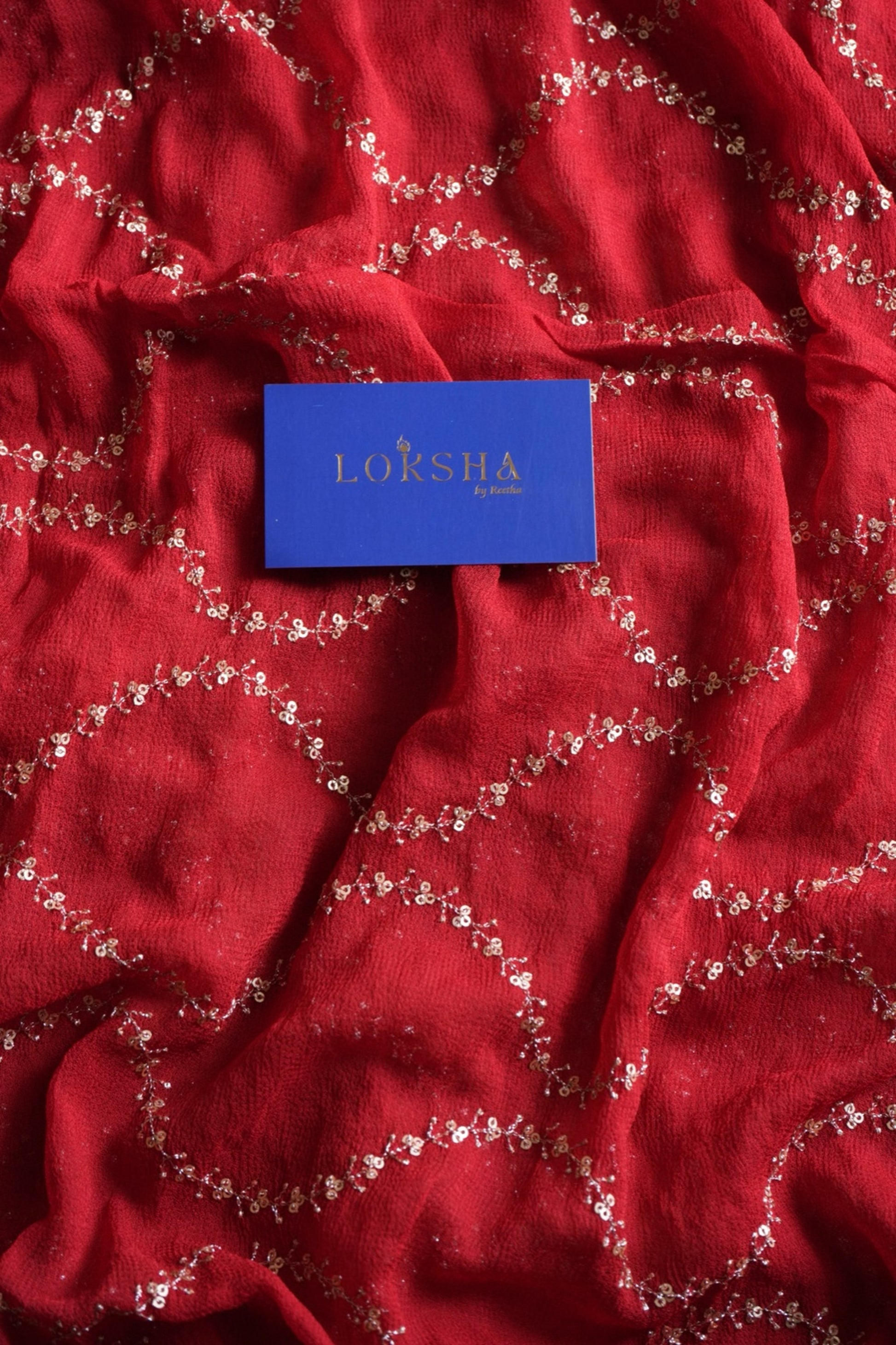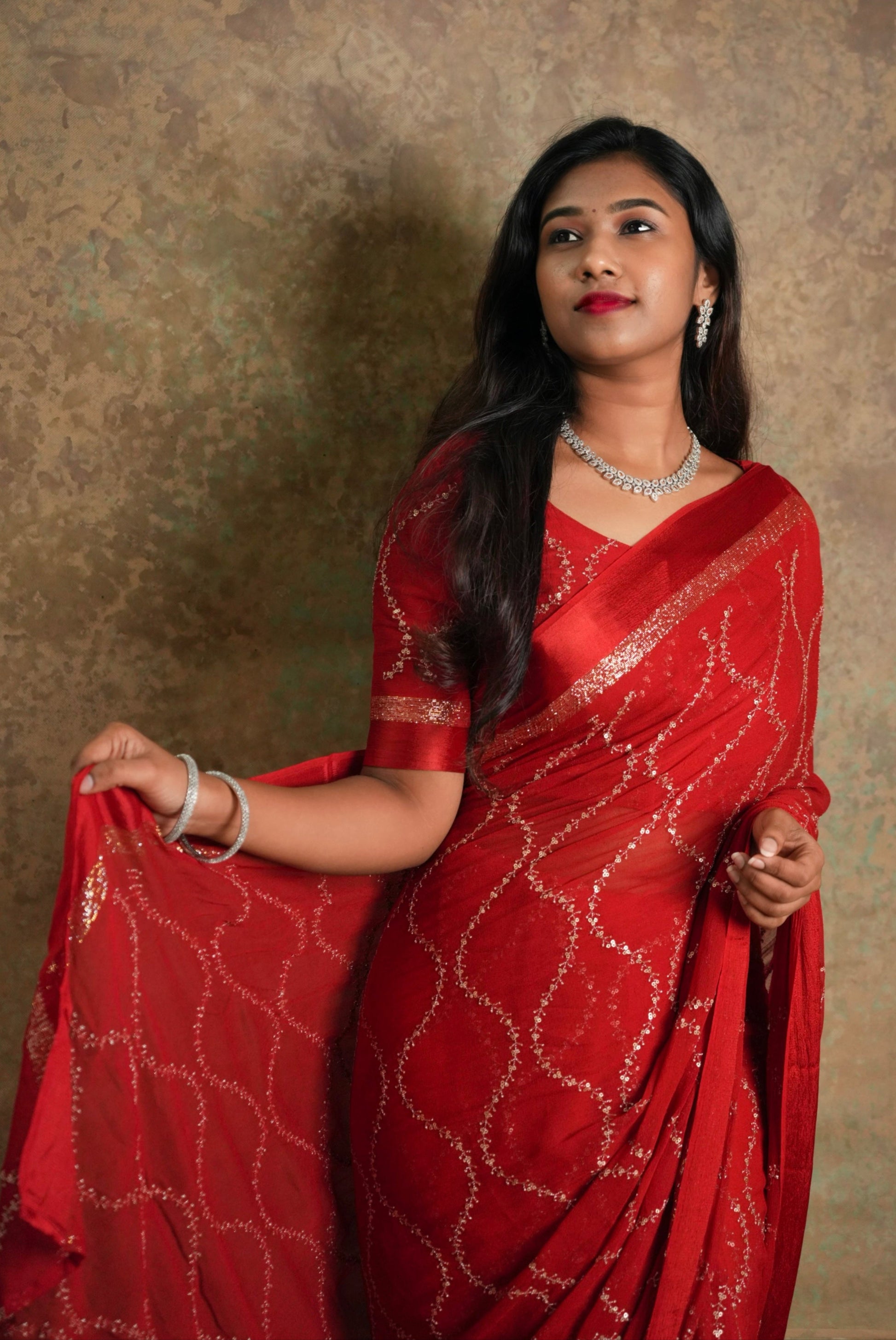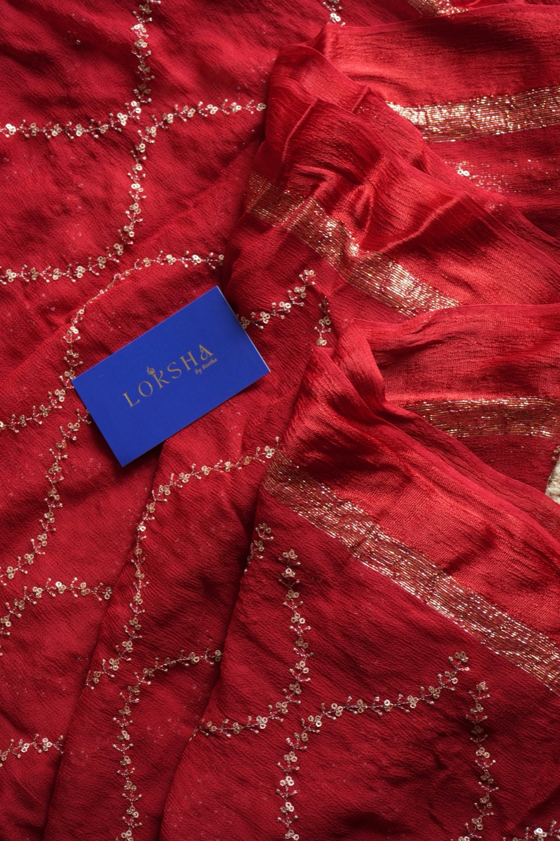 Stunning red pure viscose saree with gold thread and sequins work arranged in a delicate lattice pattern, adding a touch of sparkle to its deep crimson hue. The shimmering gold border enhances its regal charm.